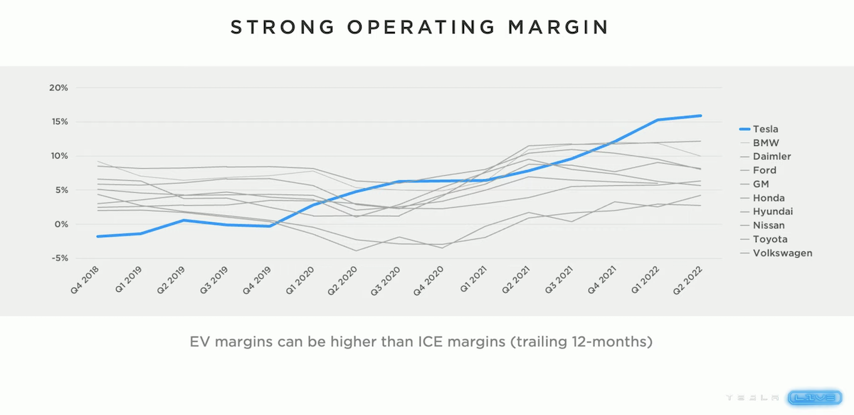 今日早些时候举办的年度特斯拉股东大会的亮点之一是一张图表,显现特斯拉在经营赢利率方面现已上升到轿车行业的第一名。以稳健的经营赢利率和毛赢利着称的奢华轿车公司现在比特斯拉低了许多。宝马奔驰不是对手,本田、现代、日产、丰田和群众也自愧不如。