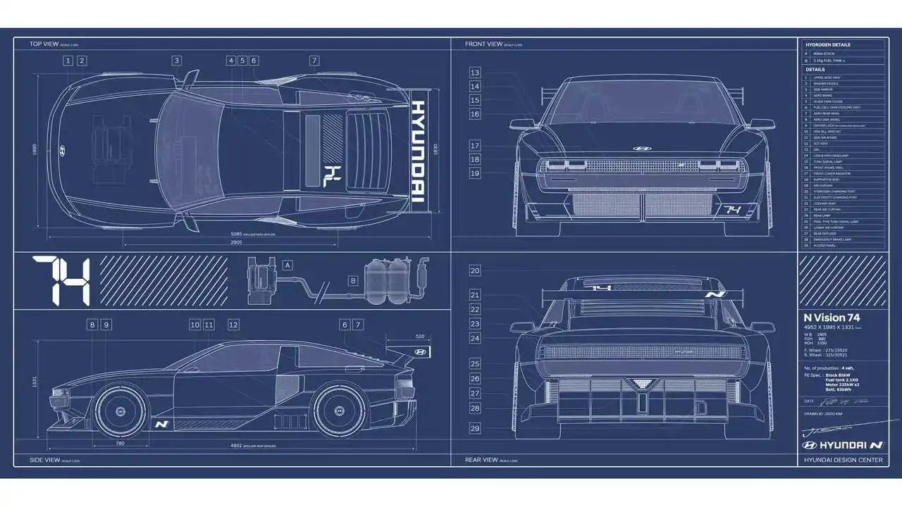 这款概念车的规划向1974 年的现代 Pony Coupe问候,这款车由传奇的意大利轿车规划师乔治亚罗规划,他还规划了 DMC Delorean、VW Golf Mk1、Lotus Esprit Series 1 和 Fiat Panda 等很多标志性轿车。但与 Pony 不同的是,Vision 74 看起来具有复古现代感,其锋利的折痕、巨大的后扰流板和类似 Ioniq 5 的数字大灯和尾灯使其看起来有些愤恨。