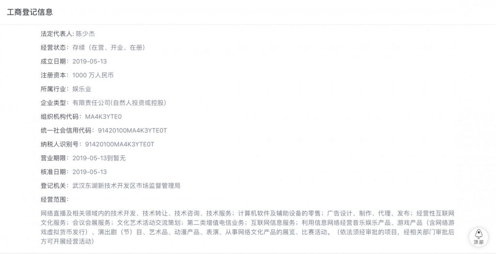 网络直播技能有限公司,法定代表人为斗鱼CEO陈少杰,注册资本 1000 万。